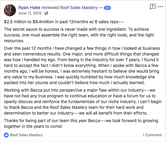 ^ This is Becca Switzer. You might recognize her from YouTube. She is always with a dog, swears sometimes, wears crazy lipstick, and drops killer roof sales and supplement knowledge. She's the creator of 6 Roof Sales Mastery programs and the author of "Diamonds in the Sky: Introduction to Storm Restoration Sales."