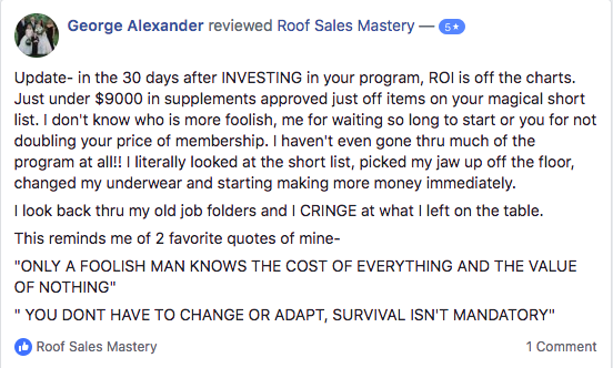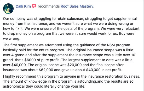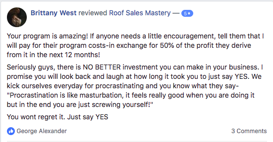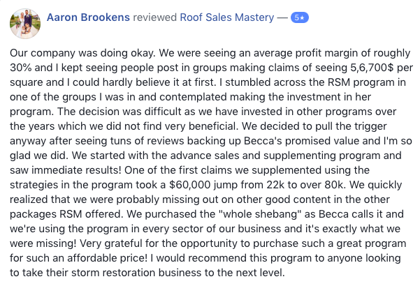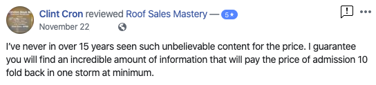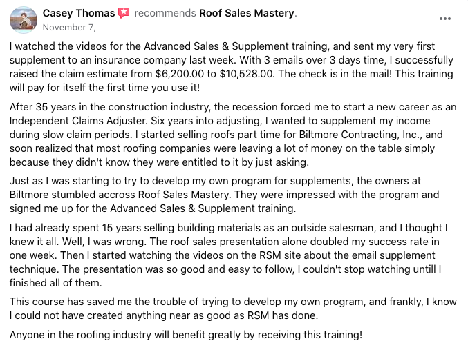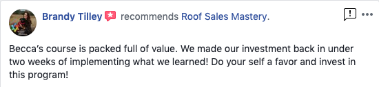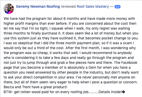 I teach roof salesmen how to sell 7 figures and earn 6 with my laid back, word-for-word sales closing scripts, door pitches, and objection-handling roof sales techniques.