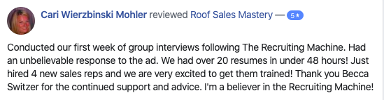 I empower roofing company owners to systematically scale their company, sales force, and profit margins with a proven TURNKEY step-by-step system that makes recruiting like turning on a faucet, eliminates “ride along training,” stops the revolving door in their sales team, and maximizes their bottom line by supplementing, to 2X their company through the 3 major cylinders: